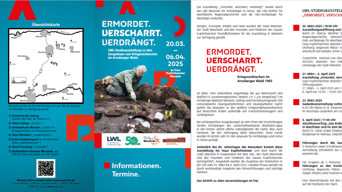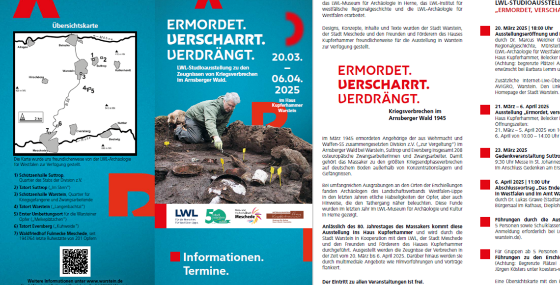 Bei Ausgrabungen an den Erschießungs-Orten fanden Archäologen des Landschaftsverbandes Westfalen-Lippe (LWL) etliche Habseligkeiten der Opfer. Diese Funde wurden 2024 im LWL-Museum für Archäologie und Kultur in Herne in der Ausstellung „Ermordet, verscharrt, verdrängt“, erarbeitet durch das LWL-Museum für Archäologie in Herne, das LWL-Institut für westfälische Regionalgeschichte und die LWL-Archäologie für Westfalen, gezeigt. In diesem Jahr wird diese Ausstellung durch die Stadt Warstein in Kooperation mit dem LWL, der Stadt Meschede und den Freunden und Förderern des Hauses Kupferhammer vom 20. März bis 6. April im Haus Kupferhammer durchgeführt. Multimediale Angebote wie Filmvorführungen und Vorträge flankieren die Ausstellung. […]