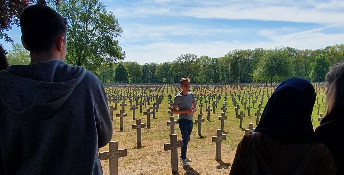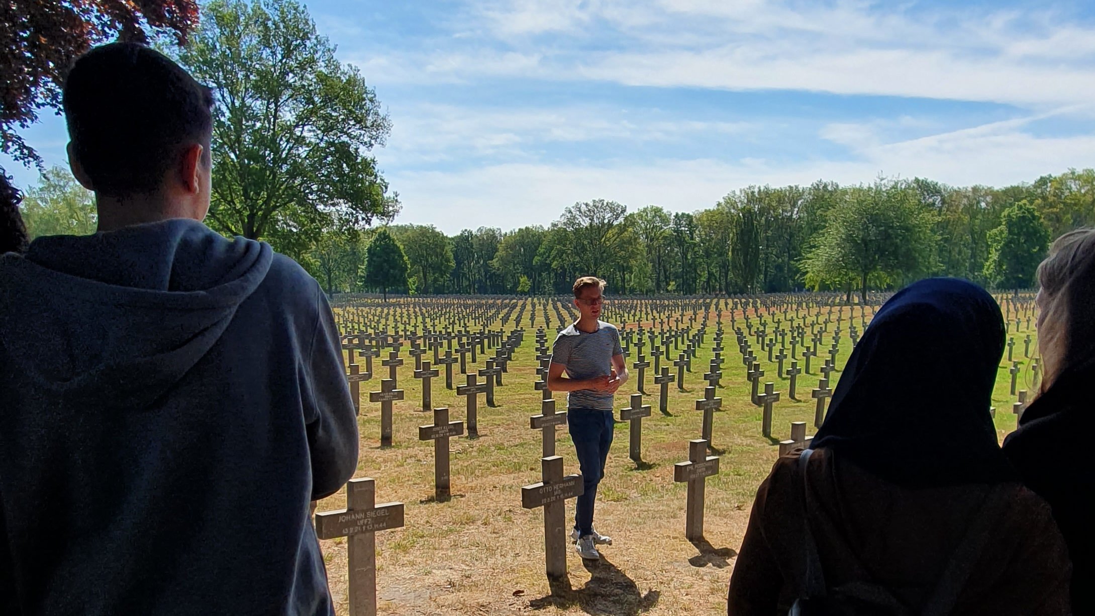 Der pädagogische Mitarbeiter Jan Heemels führte die Gruppe über die Kriegsgräberstätte. Zuvor war die Klasse durch die Bildungsreferentin auf diesen Besuch vorbereitet worden. Anhand eines Zeitstrahls lernten die Jugendlichen historische Ereignisse von 1933 bis 1945 einzuordnen, und auch, was in den Niederlanden während der deutschen Besetzung von 1940 bis 1945 geschah.