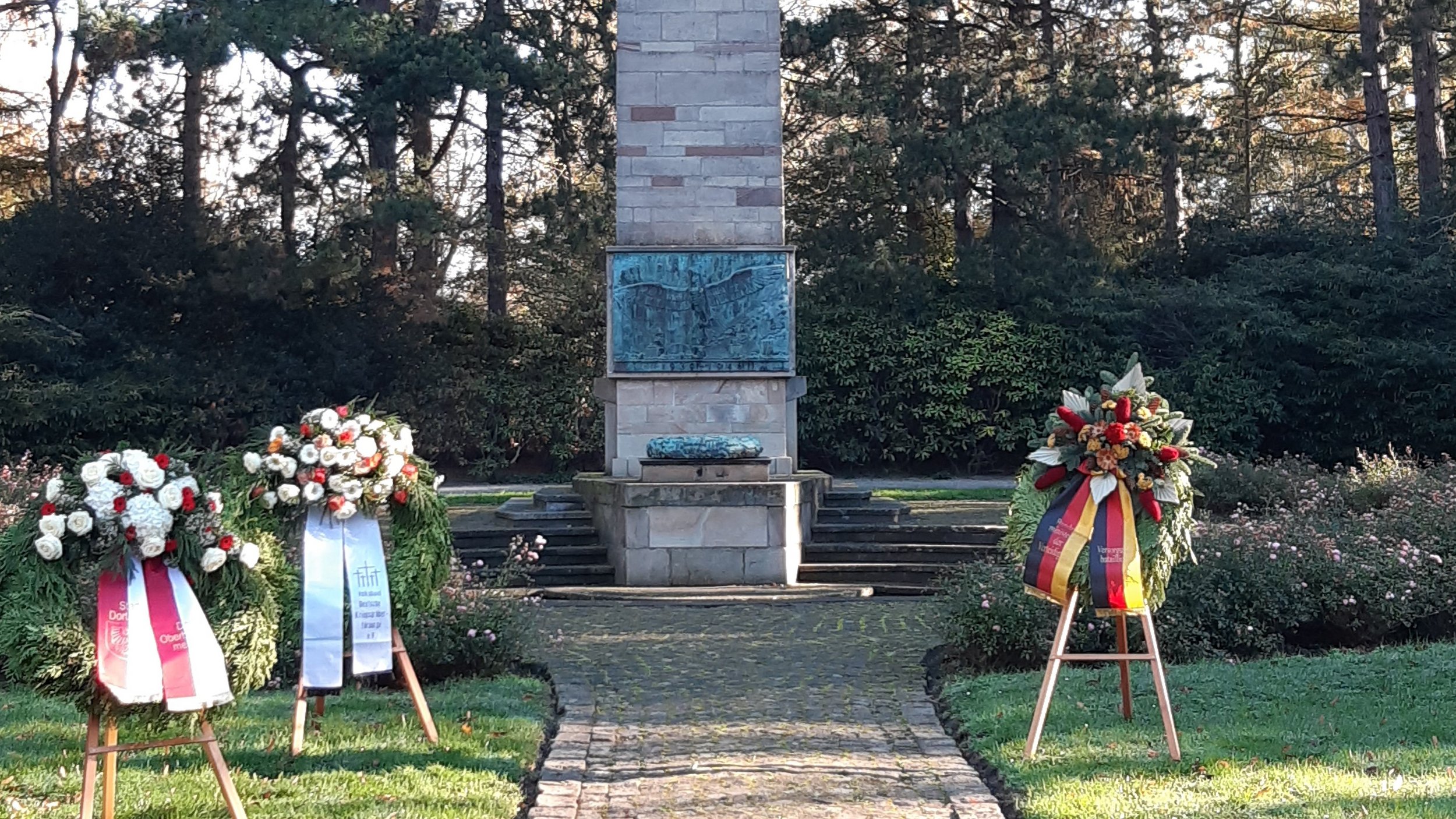 Drei Kränze wurden am Mahnmal abgelegt. Bürgermeister Schilff legte einen Kranz für die Stadt Dortmund nieder, Oberstleutnant Andreas Johannes Golks für das Versorgungsbatallion 7 aus Unna, und schließlich Dr. Stefan Mühlhofer als Vertreter des Volksbundes Deutsche Kriegsgräberfürsorge e. V., Kreisverband Dortmund.