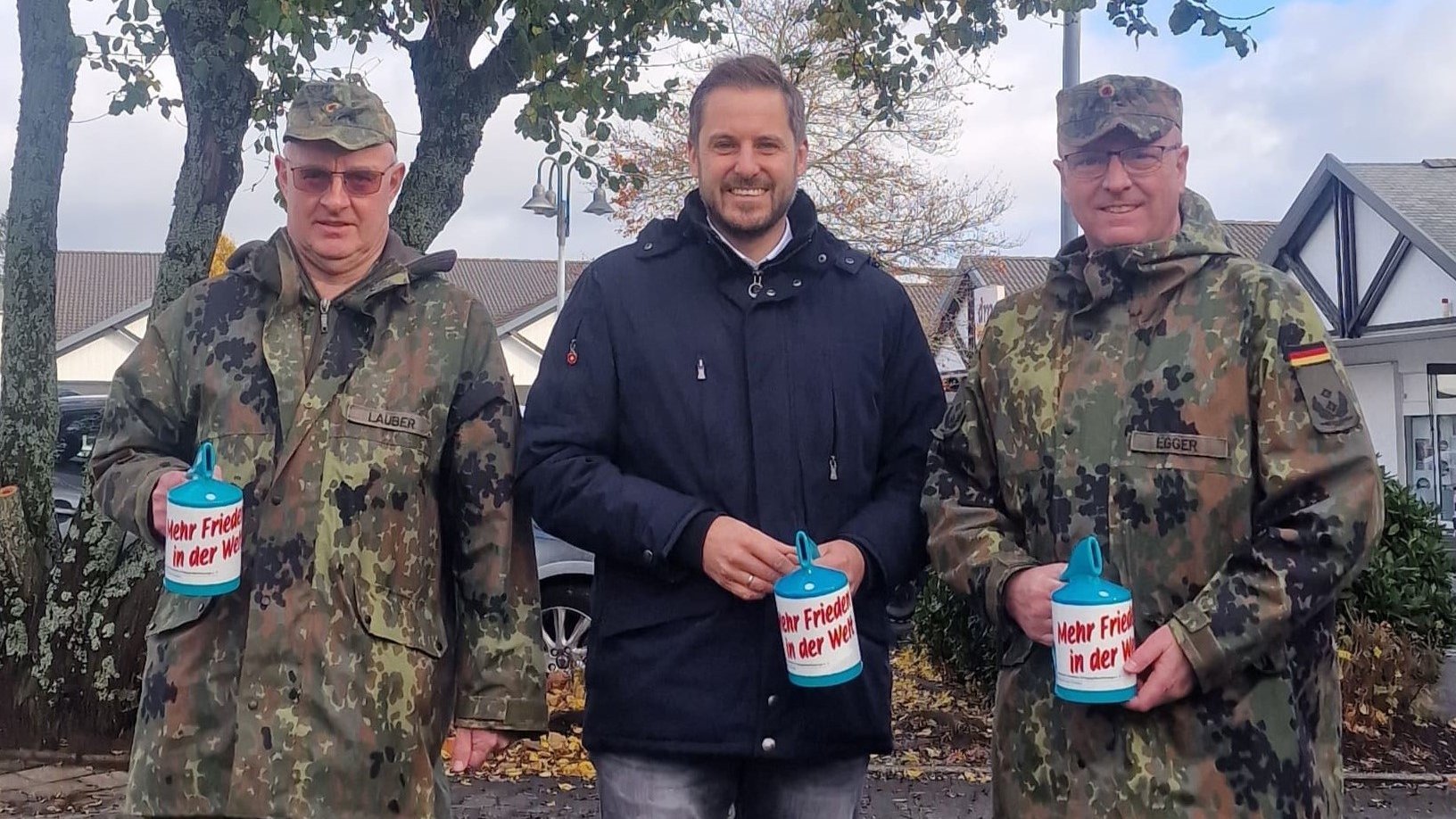 Erndtebrück. Aktuell sind die Soldatinnen und Soldaten des Luftwaffenstandortes Erndtebrück wieder für die Haus- und Straßensammlung des Volksbundes unterwegs. In gewohnter Manier sind auch der Bürgermeister der Edergemeinde, Henning Gronau sowie der Standortälteste des Luftwaffenstandortes Erndtebrück, Oberstleutnant Dirk Egger mit an Bord. Auf dem Parkplatz des Einkaufszentrums am Mühlenweg sammelten sie selbst für die Arbeit gegen das Vergessen.