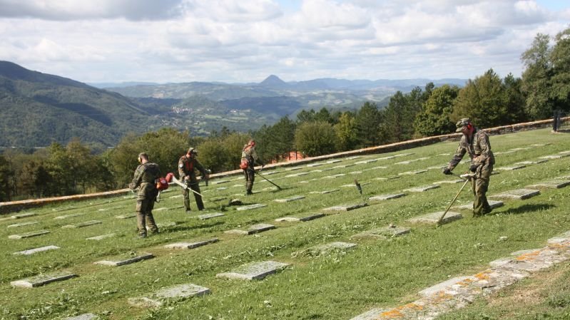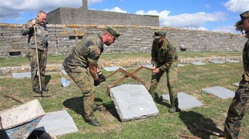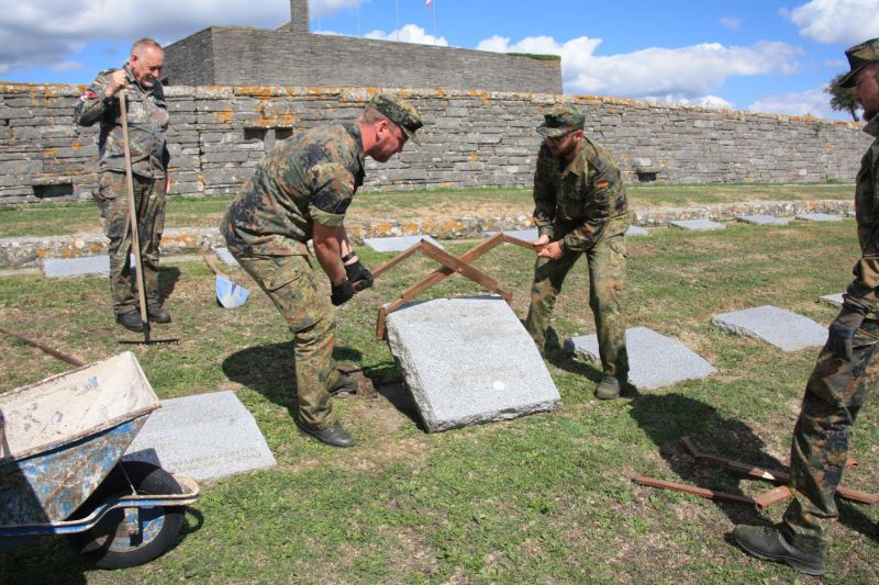 Zu den Aufgaben der fünf aktiven Soldaten und fünf Reservisten gehörten beim Arbeitseinsatz u.a. Mäharbeiten auf dem Friedhof zur Unterstützung des Pflegedienstes, das Freischneiden und Ausrichten der Grabplatten sowie Renovierungsarbeiten an den Gebäuden auf der Kriegsgräberstätte.